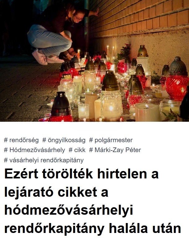 Márki-Zay Péter, Hódmezővásárhely polgármestere péntek este a közösségi oldalán bejelentette: elhunyt Szabó Zsolt, a város rendőrkapitánya. A polgármester közlése szerint a rendőr alezredes önkezével vetett véget életének.